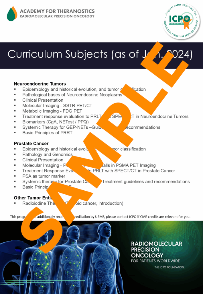 Moreover, the Academy for Theranostics holds accreditation from the Union Européenne des Médecins Spécialistes (UEMS) for its educational programs. The UEMS-EACCME (European Accreditation Council for Continuing Medical Education) certification ensures that Continuing Medical Education (CME) credits are mutually recognized by many European countries, the American Medical Association (AMA), as well as additional countries in South America, enhancing the value of our programs for medical professionals worldwide. These CME credits are essential for medical professionals to maintain their licensure and stay abreast of the latest advancements in their field.